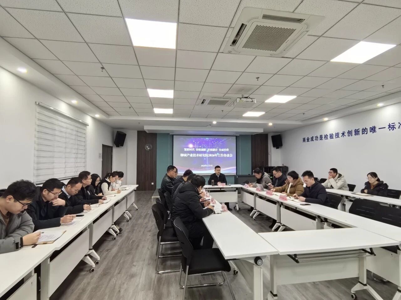 为科学谋划新一年发展蓝图,凝聚共识、汇聚合力,2026年1月7日,聊城产研院与大学科技园联合召开以“紧跟时代,持续创新,开放融合,全面经营”为主题的2026年度工作务虚会。会议由高新区管委会副主任、市产研院院长田存伟主持,聊城产研院与大学科技园全体员工参加。